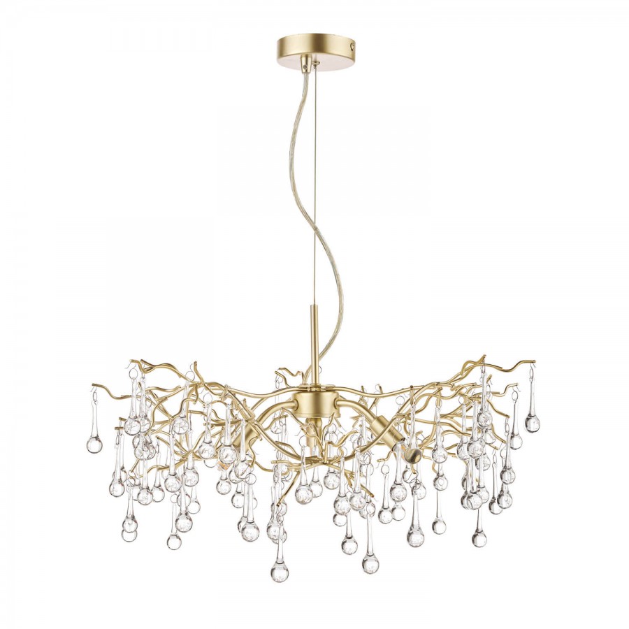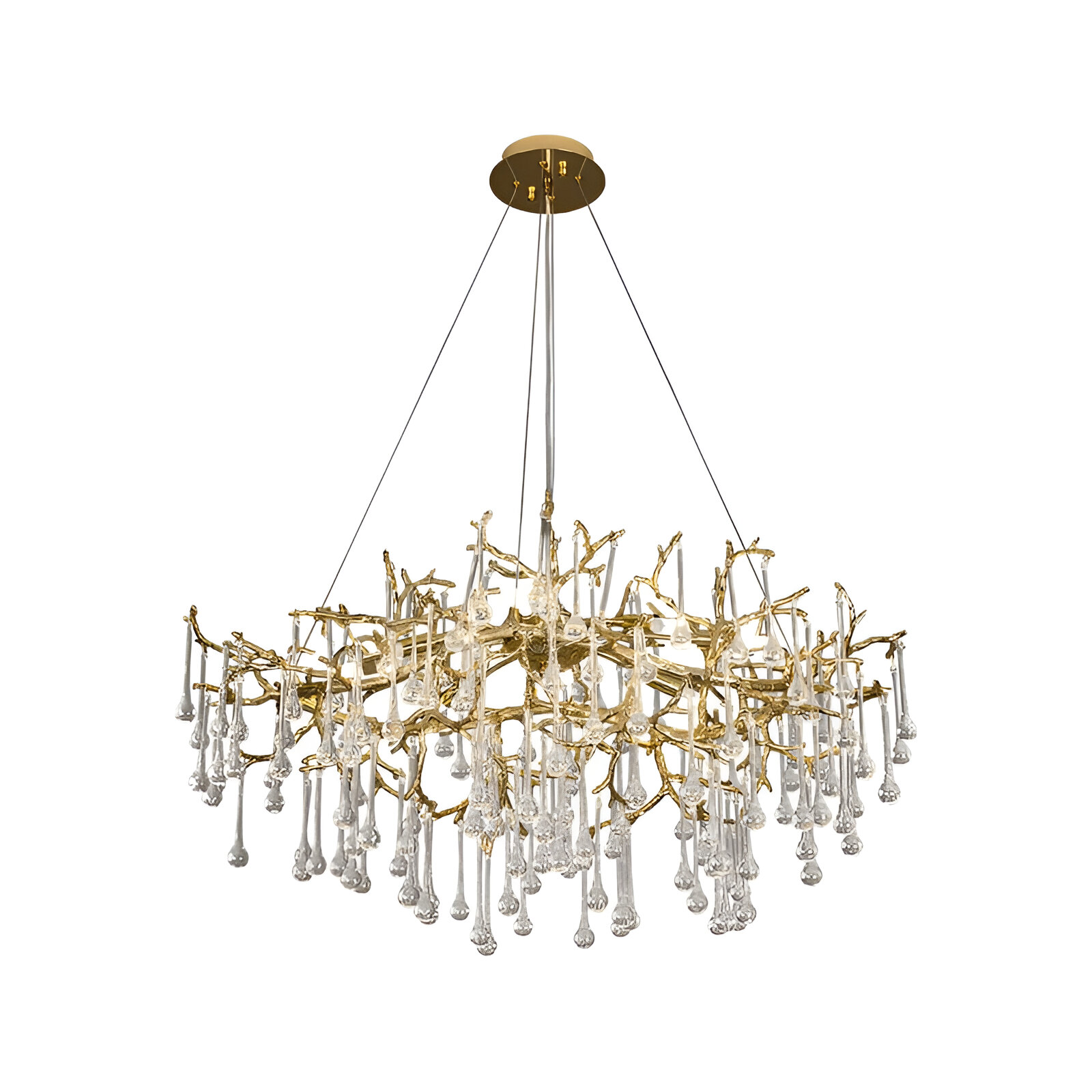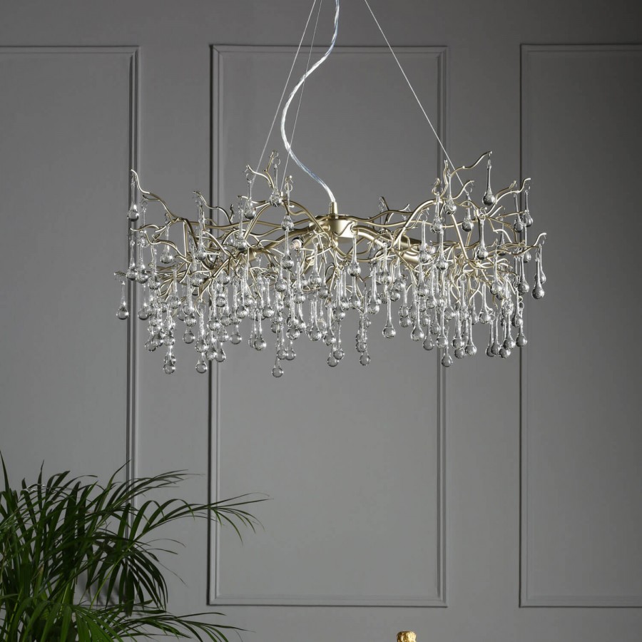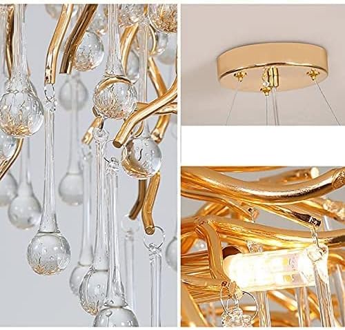 Lámpara de techo Blumenau con acabado champán satinado. Brazos con tres puntos de luz y forma de Rama de Sauce cubierta de “gotas de lluvia” de cristal. Cadena para colgar y cable transparente incluido. Para Sala de Estar, Comedor, Dormitorio, Villa, luz de Sala de Estar, luz nórdica, Rama de Gota de Agua de Lujo.